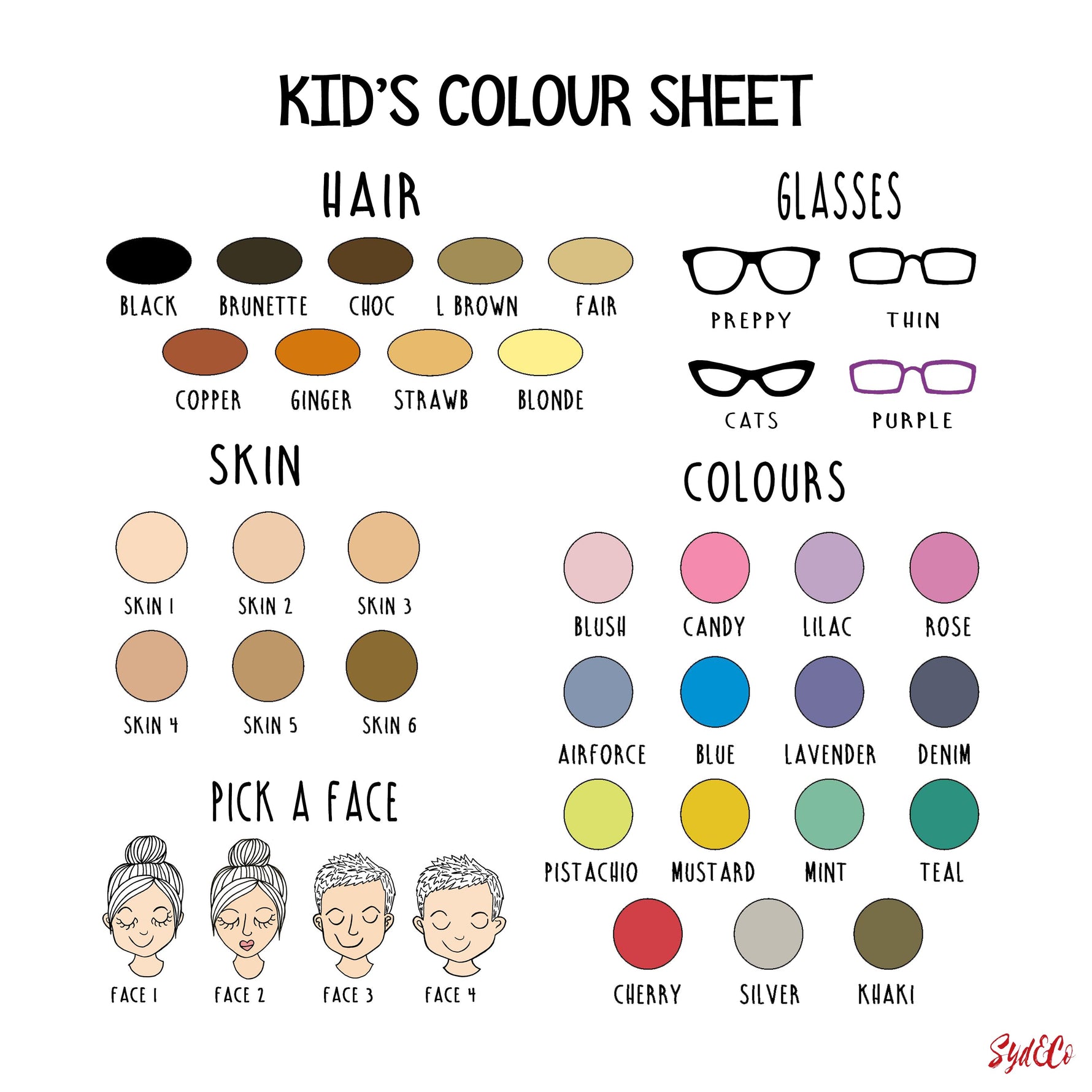 Check out the illustrated character sheets in the photos and pick your choices from the dropdown menus.
