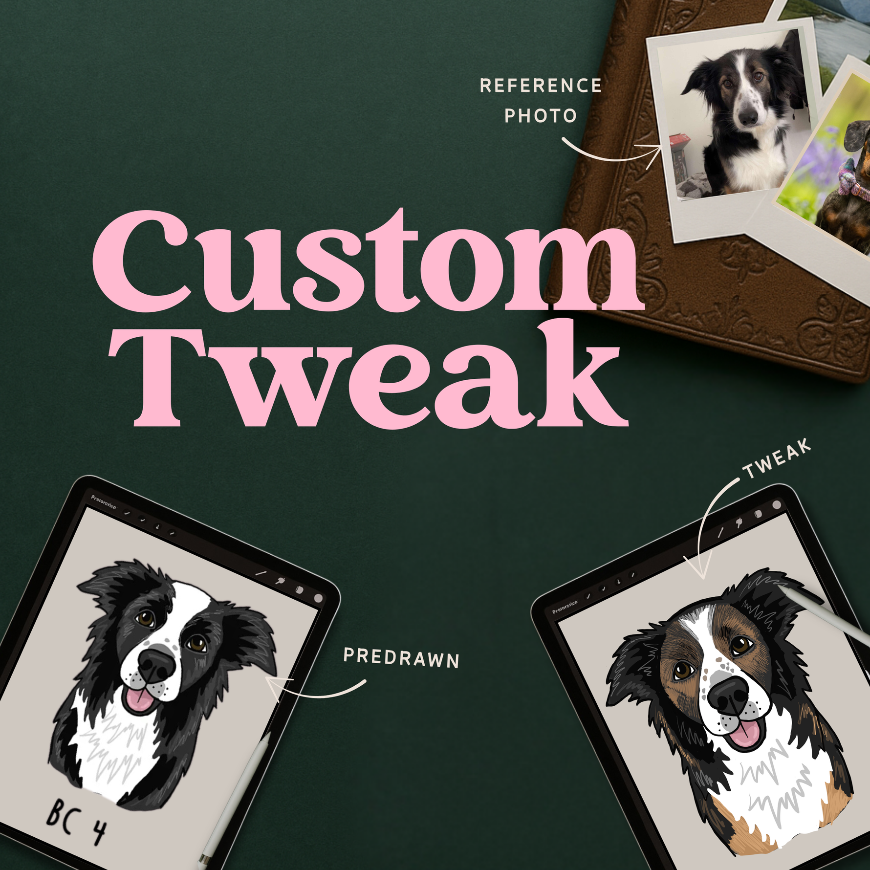 Tweaks do not include changing the overall shape of the design or facial expressions. If your tweak is overly complicated we advise getting a custom drawing.