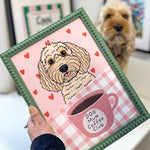 Brighten up your walls and celebrate your love for your pet with this statement print featuring a hand-drawn illustration of your dog surrounded by hearts and gingham charm.